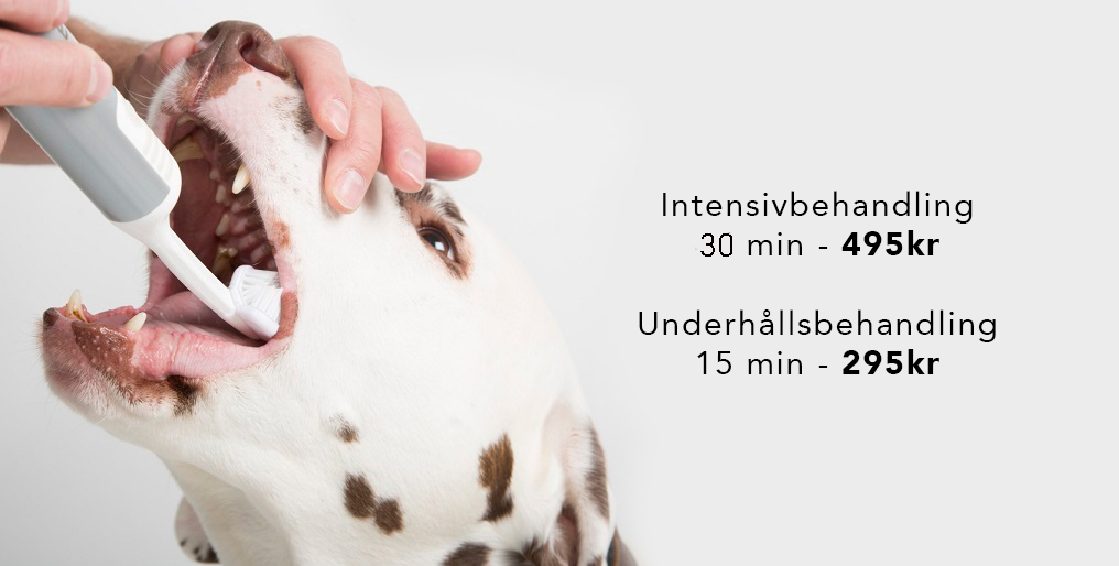 Har din hund dålig andedräkt? Vi erbjuder borttagning och underhåll av tandsten med ultraljudstandborste. Vid behandling rengörs hundens tänder med ultraljud som effektivt reducerar bakterier, plack och tandsten utan att behöva söva eller ge lugnande. Tandstenen avlägsnas försiktigt med en tandskrapa. Tandborsten tillsammans med en speciellt framtagen tandgel rengör helt tyst och utan rörelser eller vibration från borsthuvudet. Det gör rengöringen mycket skonsam och stressfri. Ultraljudet tränger ner i vävnaden runt tänderna och ner i eventuella tandköttsfickor som är en grogrund för bakterier. Förutom att behandlingen verkar bakteriedödande förbättrar den även blodcirkulationen samt möjliggör eventuell inflammation att avta och läka.