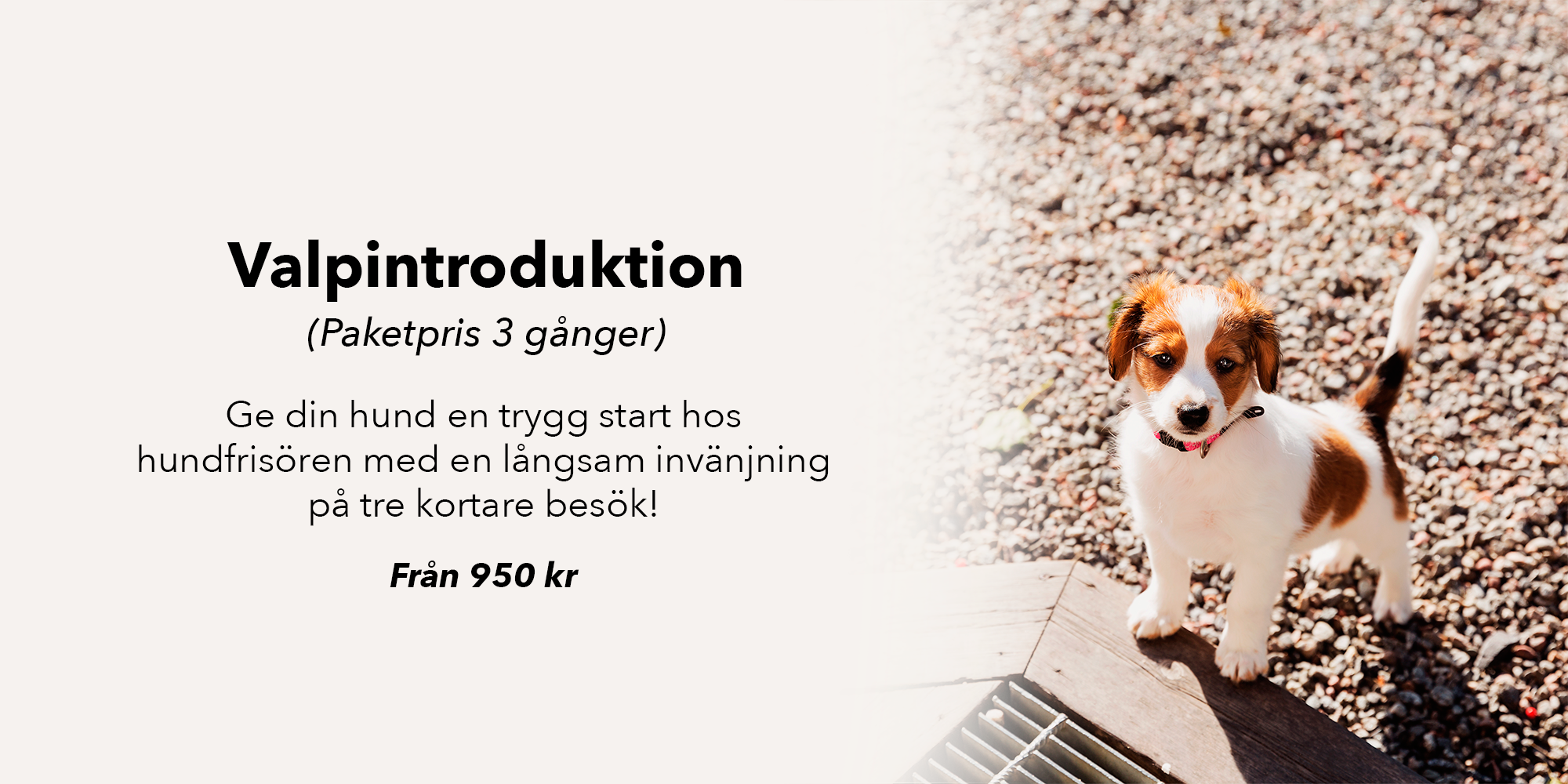 Tanken med en valpintroduktion är att din valp ska få möjlighet att lära sig att det är mysigt att gå till hundfrisören. Om man väntar för länge innan första besöket kan det bli jobbigt för valpen – särskilt om pälsen blivit tovig och svår att reda ut.