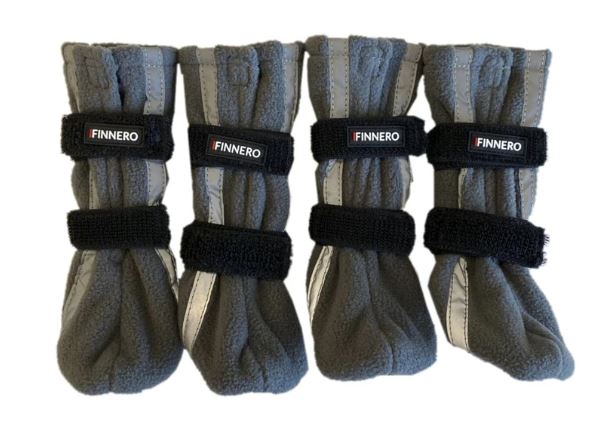 Finnero's Hundskor Halla Booties skyddar hundens tassar i snö och håller dem varma i frost och kallt väder. De är kända för goda passform och populära tack vare att det går upp en bit på benet.