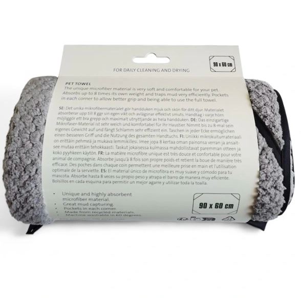 K9 Pet Towel är en mycket mjuk och superabsorberande handduk i microfiber. Hundhandduken är tillverkad av återvunnet material och suger upp 8 gånger sin egen vikt. Tack vare fickorna i hörnen får du bra grepp om handduken när du torkar din hund eller katt.