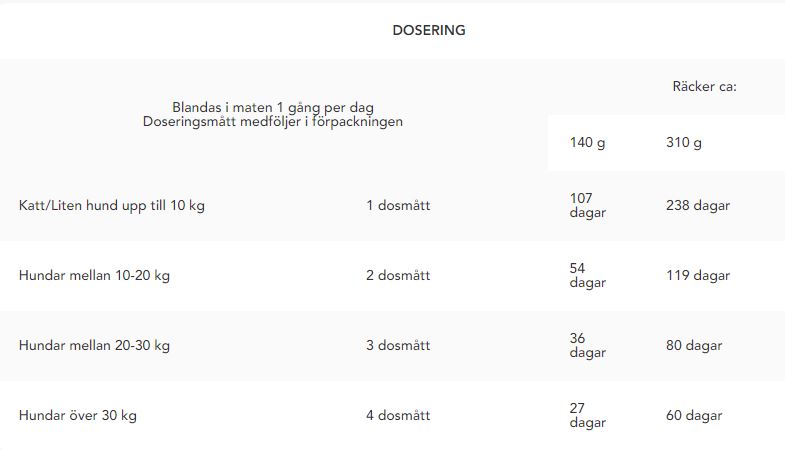 Varningstext: Till hundar med känslig mage så rekommenderar vi att man startar med en låg dos och sakta ökar upp, fungerar detta inte så rekommenderar vi att man provar Hyaluron+ istället som är skonsammare mot en känslig mage. Varningstext: Är din hund allergisk mot skaldjur så rekommenderas inte denna produkt.