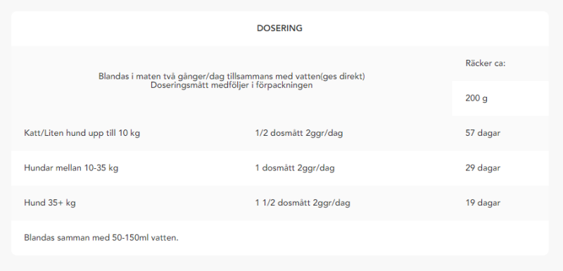 Det är lätt att dosera ut tillskottet eftersom det kommer med ett doseringsmått. Ser du inte det vid första anblick när du öppnar burken så kan de ligga längre ner i pulvret. Dosering hittar du alltid vid burkens baksida eller längre ner på sidan här nere.