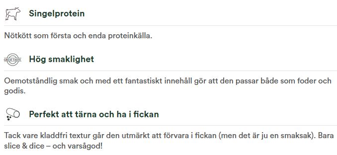 Köttiga, spannmålsfria och Monstergoda korvar. Serveras med fördel som helfoder, men funkar kanske allra bäst som belöningsgodis? Tack vare kladdfri textur går den utmärkt att förvara i fickan (men det är ju en smaksak). Bara slice & dice – och varsågod!