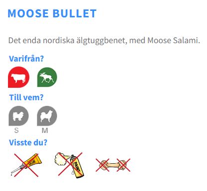 Det första fyllda älgtuggbenet! Moose Bullet är i en storlek som passar för små och medelstora hundar. Den Äkta Finska ÄLGsalamin som rostats till perfekt krispighet får hunden att göra vad som helst för att få sin delikatesstund! Utsidan på detta tuggbenet är gjort i råhud av älg medan insidan består av en knaprig älgkorv med nöt.