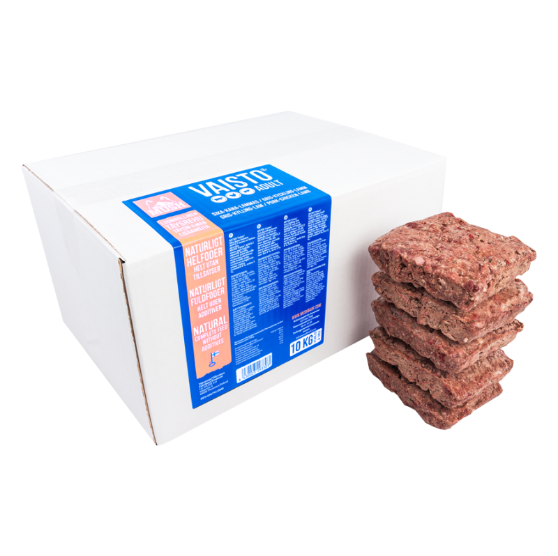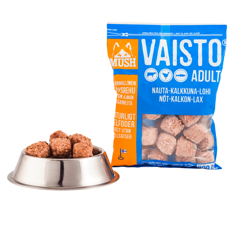 MUSH Vaisto® blå (nöt-kalkon-lax) blå är ett helfoder för vuxna hundar. MUSH Vaisto® blå passar för alla vuxna hundar och är speciellt bra vid olika typer av problem med hud och/eller päls. Ben 8 %, lever 5 %.