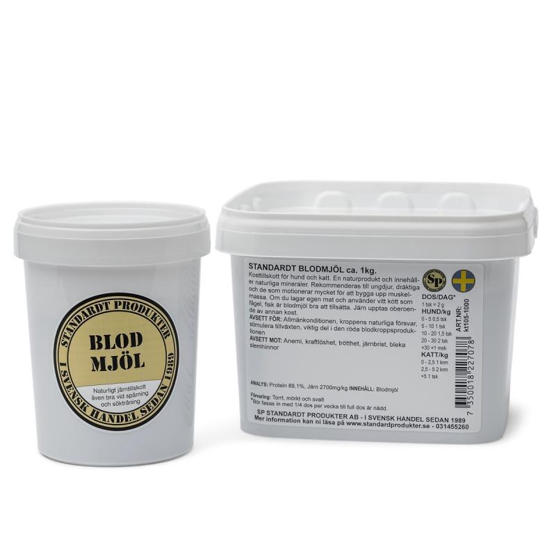 Om du lagar egen mat och använder vitt kött som kyckling, kalkon eller annan fågel är blodmjöl bra att tillsätta. Även till fläsk, lamm, vom och fisk rekommenderar vi att tillsätta Standardt BLODMJÖL. Dessa råvaror är blodfattiga och ett blod/järntillskott förhöjer näringsinnehållet i den egenlagade maten. Blodmjöl upptages oberoende av annat födoämnesintag och dosen är optimerad med avseende på ingående komponenter. Järn upptas oberoende av annan kost men tänk på att det hämmar kalkupptaget om de intas tillsammans.